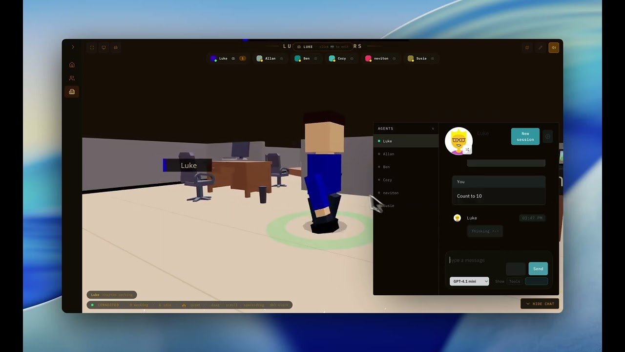 Lock the 3D camera onto any team member and watch them work in real-time. Stay connected with your AI workforce.